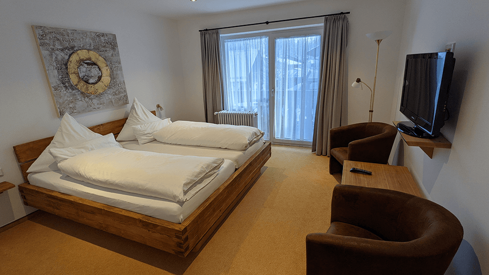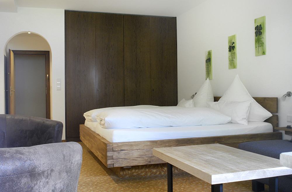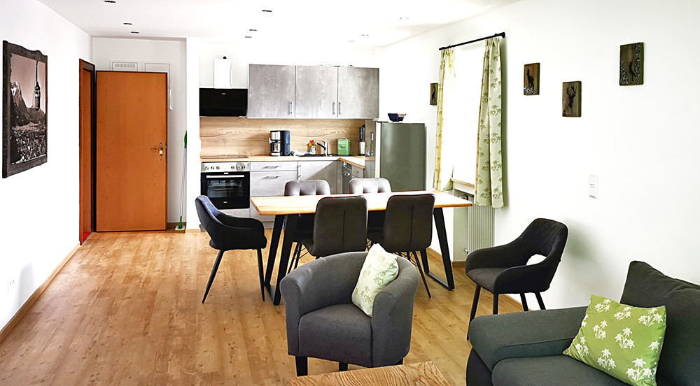 Die Ferienwohnung „Großer Waxenstein“ im ersten Obergeschoss bietet Komfort für bis zu sechs Personen (vier Erwachsene & zwei Kinder) in einem gemütlichen Ambiente mit imposantem Blick auf die umliegenden Berge. Neben dem großzügigen Wohnbereich erwarten Sie zwei Schlafzimmer mit jeweils einem eigenen Bad. Das Highlight unserer Ferienwohnung: Zwei Balkone auf Ost- und Südseite mit faszinierendem Bergblick.